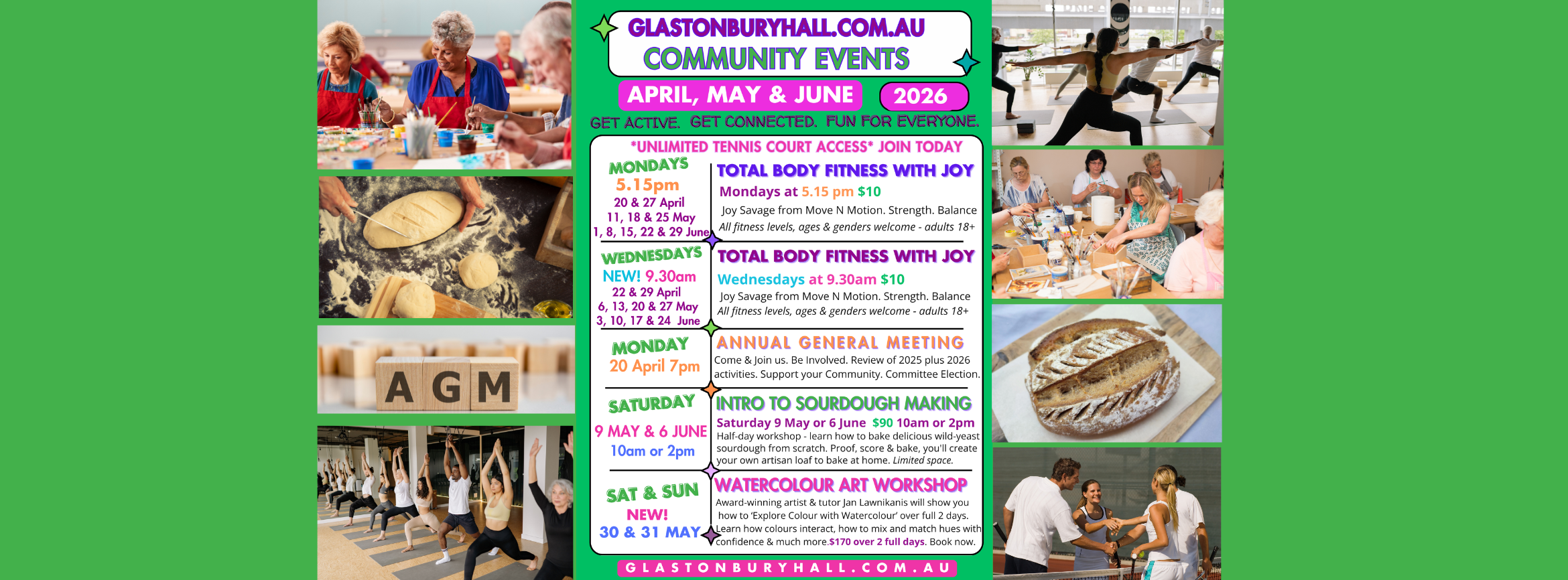 Our air-conditioned/heated Glastonbury Hall is the ideal venue for meetings, weddings, birthdays, celebrations, reunions, memorials, fitness or art classes as well as community gatherings. Maximum capacity of 60 - 80 for a seated catered event. Book your next event today